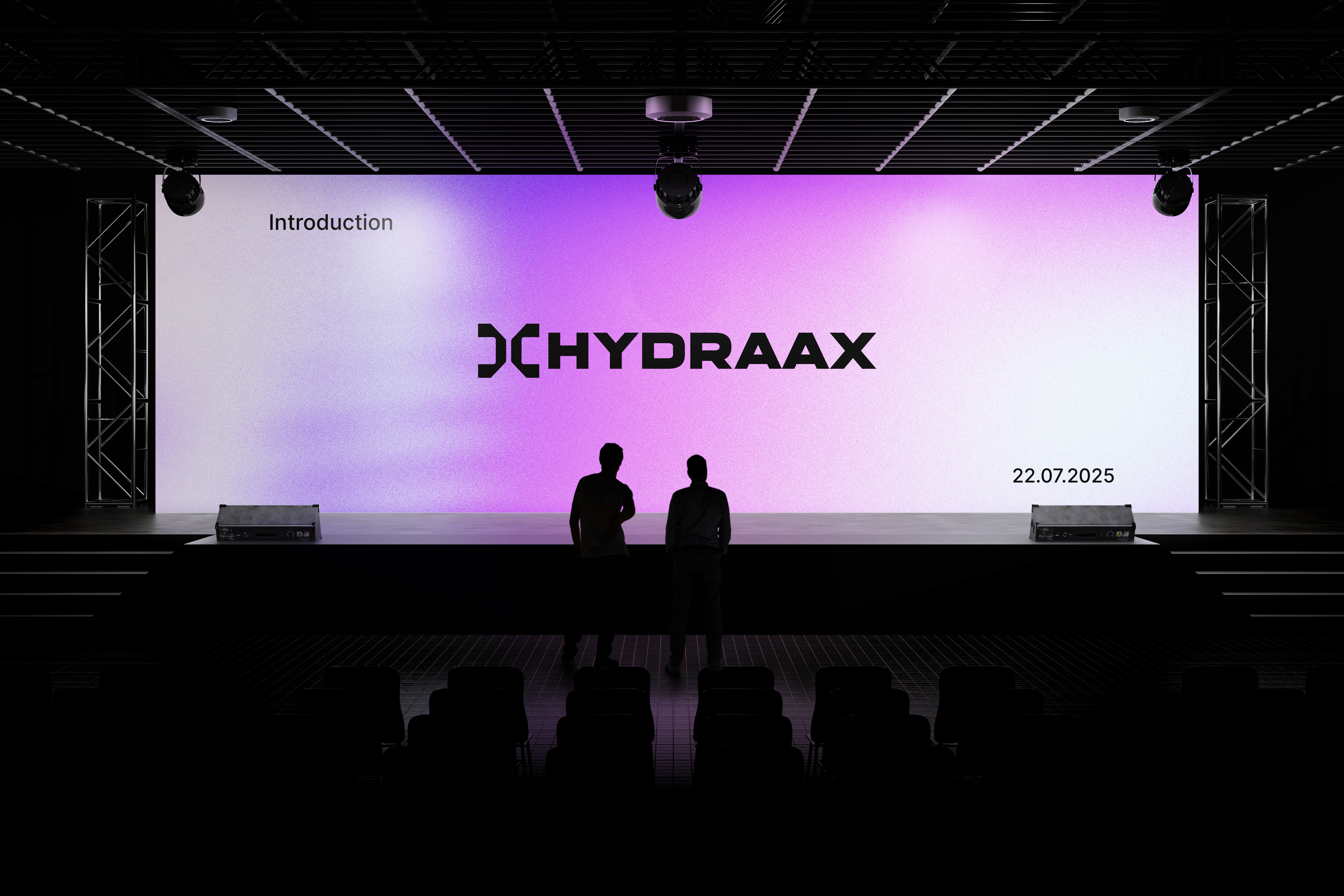 The identity system centers on geometric clarity and engineered restraint. A modular octagonal logomark, constructed on precise 45° angles, creates an abstract "K" through negative space — suggesting energy flow, technical rigor, and electromagnetic field dynamics. The visual architecture extends across technical datasheets, web interfaces, and brand collateral, maintaining consistency from investor presentations to engineering specifications. As part of the system, NVRFOUND developed Hydrax, a sister brand positioning Kalbhorz's technology for marine propulsion markets — bridging B2B credibility with end-user accessibility through distinct nomenclature and a mirrored-bracket identity that balances technical authority with approachable clarity.
